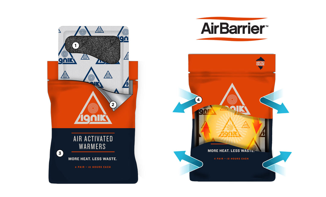 Each set of Ignik warmers comes in a resealable AirBarrier™ pouch, which you can use to extend the lifespan of your warmers. If you come in from the cold while your warmers are still working, you can store the opened warmers in the AirBarrier™ pouch and reuse them up to 72 hours later. AirBarrier™ keeps the air out for more reliable heat and is 100% Recyclable.